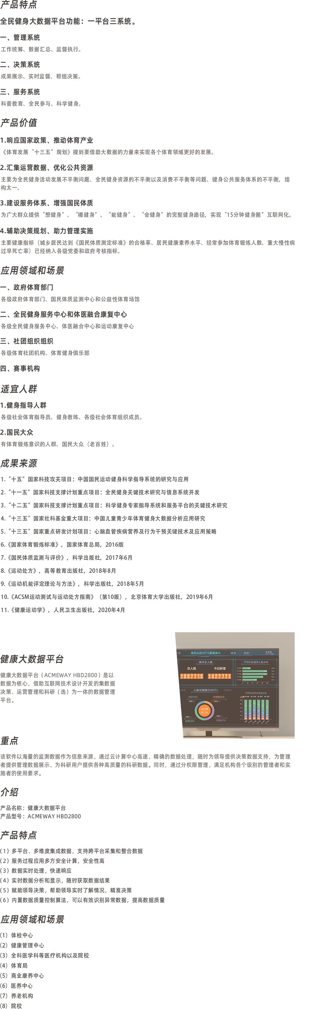 全民健身大數(shù)據(jù)平臺(tái)(ACMEWAY NBD1800)充分利用群眾體育部門(mén)及其他體育部門(mén),以及政府部門(mén)各類(lèi)資源優(yōu)勢(shì),如科學(xué)健身指導(dǎo)、國(guó)民體質(zhì)監(jiān)測(cè)、全民健身狀況調(diào)查、國(guó)家體育鍛煉標(biāo)準(zhǔn)、低開(kāi)免開(kāi)體育場(chǎng)館、社會(huì)體育指導(dǎo)員培訓(xùn)和管理、體育社團(tuán)組織管理、公益性活動(dòng)與賽事、政策法規(guī)發(fā)布等等,共同構(gòu)建全民健身大數(shù)據(jù)平臺(tái),滿足不同主體對(duì)全民健身的不同需求,實(shí)現(xiàn)決策分析、統(tǒng)籌管理、全民服務(wù)的需求,以此打通決策、管理、服務(wù)、信息、資源的壁壘,推動(dòng)大眾運(yùn)動(dòng)健身,增強(qiáng)科學(xué)指導(dǎo)意識(shí),吸引大眾積極主動(dòng)參與體育鍛煉,促進(jìn)大眾養(yǎng)成良好的鍛煉習(xí)慣,從而提高國(guó)民體質(zhì)健康水平